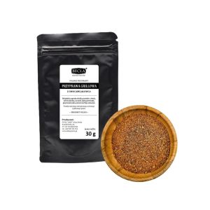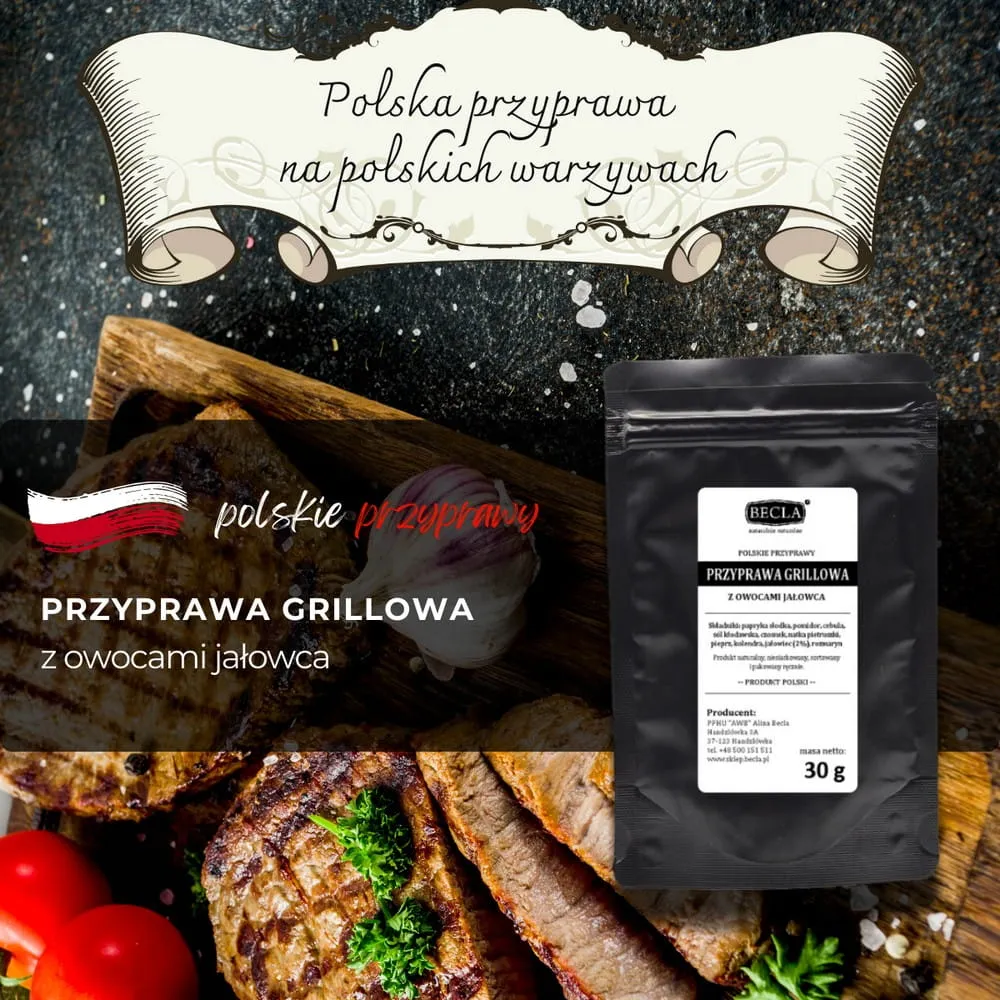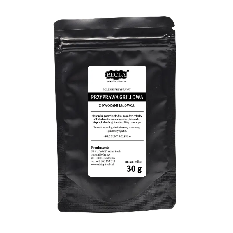 Przyprawa grillowa z owocami jałowca marki Becla to doskonały wybór dla smakoszy ceniących naturalne produkty. Ta sproszkowana mieszanka wyselekcjonowanych ziół oraz najwyższej jakości warzyw pochodzących od polskich rolników, gwarantuje wyjątkowy smak i aromat każdej potrawy. Przyprawa jest ręcznie sortowana i pakowana w czarny doypack z zamknięciem strunowym, co zapewnia jej świeżość. Bez konserwantów, wzmacniaczy smaku i glutaminianu sodu - tylko naturalne składniki. Idealna na grilla do kiełbasek i innych mięs oraz do marynat. Nasza przyprawa grillowa to gwarancja naturalnego smaku i składu oraz wsparcie dla polskiej firmy rodzinnej i polskich rolników.