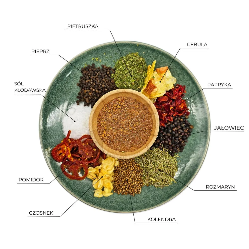 Seria POLSKIE PRZYPRAWY powstała z myślą o stworzeniu wysokiej jakości oryginalnych mieszanek przyprawowych opartych na polskich składnikach. Nasze receptury bazują na wyprodukowanych w naszym zakładzie warzywach pochodzących od polskich, lokalnych rolników. Kompozycję dopełniają zakupione zioła i przyprawy wyprodukowane na terenie naszego kraju. W recepturze znajdują się również składniki, których nie da się uprawiać na szeroką skalę w naszych warunkach klimatycznych, jak na przykład pieprz, dodając mieszance charakteru.