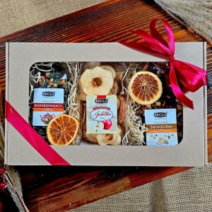 Zestaw prezentowy na Boże Narodzenie składający się z herbatki z imbirem, suszonych chipsów jabłkowych oraz mieszanki owoców na kompot wigilijny. Naturalne produkty, ręcznie pakowane, idealne na świąteczny prezent.